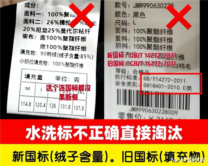 另外还要学会对比国标上的具体信息是不是对得上,比如吊牌写的是新国标,水洗标却写旧国标,一看就是假的。