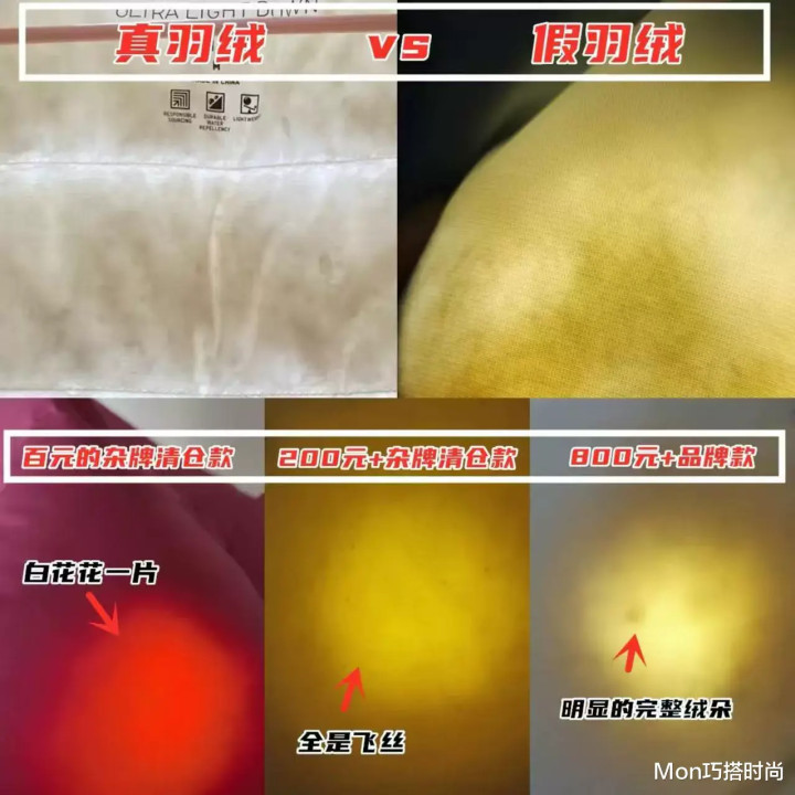 所以,羽绒服买回家之后,咱们第一步可以先找个手电筒照一照,是真是假立马就能辨别出来。