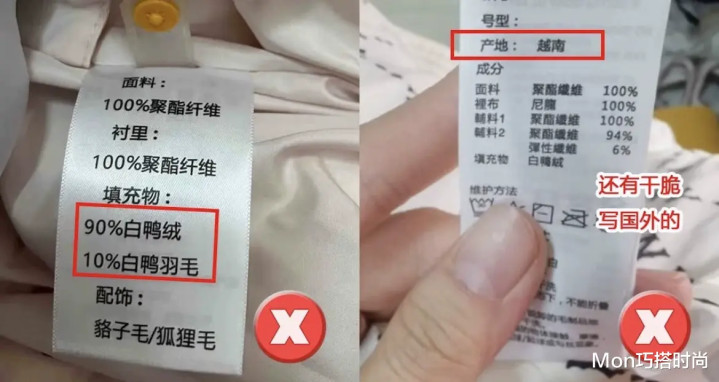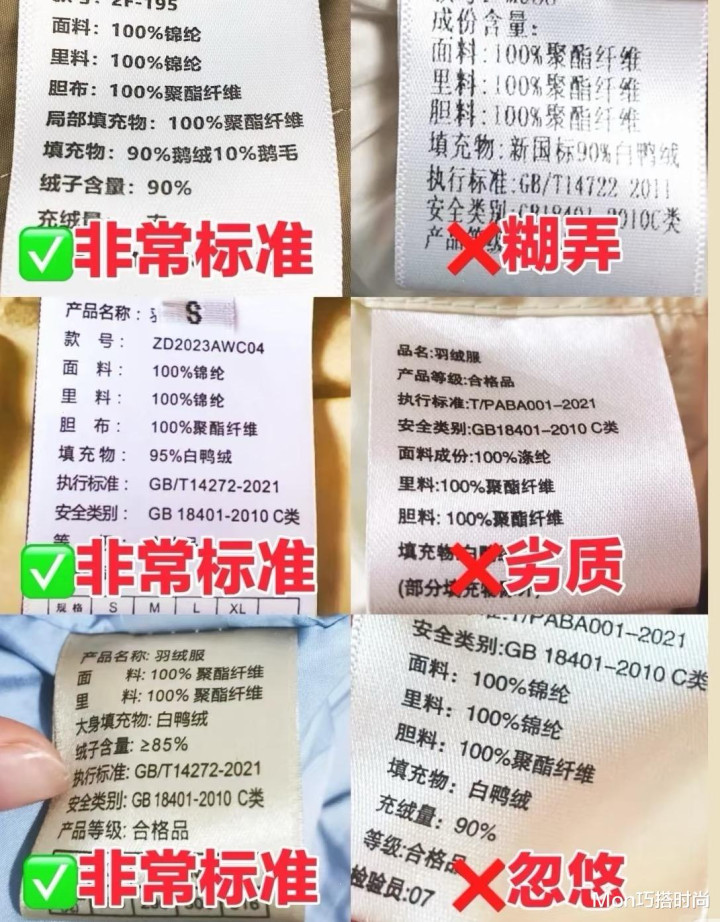别以为学会了看吊牌就万事大吉了,其实现在好多不良商家也会在吊牌上做手脚,吊牌上标的全是 “达标数据”,结果羽绒服里面根本不是这样的,穿上一点不保暖,你可能都不知道为啥。