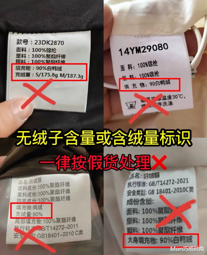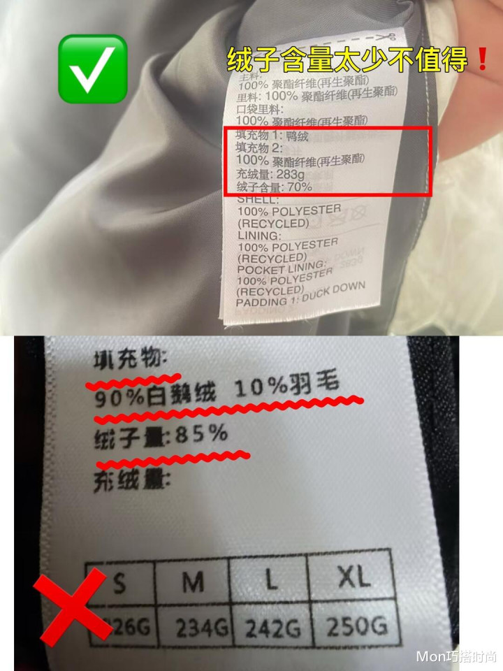 这里提醒下大家,选羽绒服的时候一定要盯紧绒子含量和含绒量的标识,要是吊牌没有明确写 “绒子含量 XX%”,或者把 “90%” 的数值标得很大却没写 “绒子含量”,全是想耍套路的旧款或假货,看到了请你果断放下!