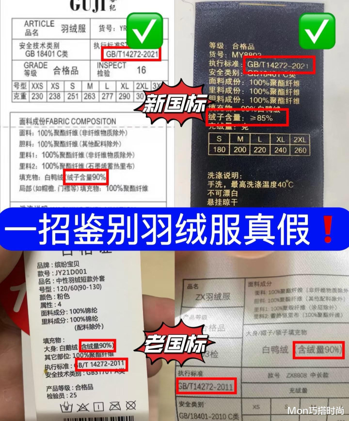 买羽绒服的时候,咱们第一步就得看吊牌上面的国标数据,学会判断新国标和旧国标,并且要确保国标的数据准确,才能少走弯路。